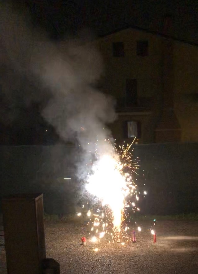 15 minuten voor 00:00 heb ik nog even geskyped met mijn ouders in Nederland. We hebben even samen geproost. Ook hier in Italië hebben ze een soort "kinder"wijn, dus mijn jongste zusje en ik konden toch nog meedoen. Om 00:00 had ik natuurlijk iedereen een 'buon anno' gewenst en daarna zijn we naar buiten gegaan. Want mijn vader hier had vuurwerk gekocht, sterretjes voornamelijk maar ook wat anders. Ik heb heel erg gelachen want mijn jongste zusje wilde echt voor geen meter een sterretje vasthouden. Het deed me denken aan mezelf jaren geleden hahaha. Overal om ons heen werd er hevig vuurwerk afgestoken. Het leek bijna op bommen in plaats van vuurwerk. Mijn familie vertelde dat normaal gesproken dit nooit gebeurt zo heftig. Ik vond het juist wel leuk, een extra knaller voor het nieuwe jaar.