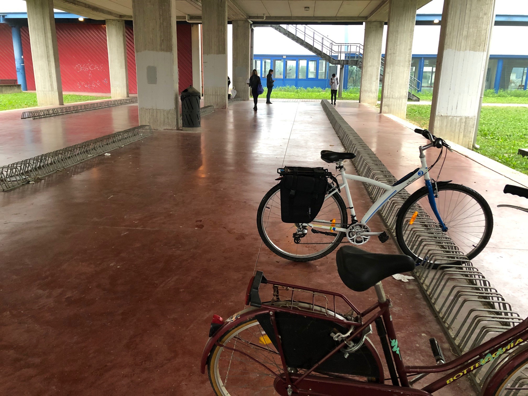 Bijna alle leerlingen gaan met de bus/auto naar school. Heel weinig gaan fietsend. Helemaal als het regent in de ochtend, dan ben ik de enige op de fiets. Ik heb een prachtige foto genomen van de fietsenstalling op school. De mooie mountainbike is van mij. De enige andere fiets die er staat, die staat er altijd. Dit was dus op een ochtend toen het regende. Normaal gesproken staat deze hele fietsenstalling vol met fietsen. Die dag was ik de enige. Mijn familie probeerde mij te overtuigen om de bus te nemen, maar die dag daarvoor werd ik ook al met de auto gebracht. Ik wilde heel graag weer even fietsen, dus heb ik 2 truien aangetrokken. Ik weet niet hoe, maar ik ben NIET doorweekt aangekomen!!